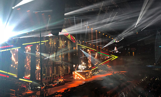 此次演唱会,为了能更好与观众互动,无论是音响、视觉、还是舞台设计,萧敬腾皆全程参与讨论,不惜成本重金制作,只为带给观众最超值的听觉与视觉飨宴。此次采用的舞台背景为星空游戏镂空屏P6.944,整体面积1000平方,庞大的舞台制作规模,根据舞台造型多样化搭建,利用屏体自身通透、轻薄、炫彩特点,强化舞台空间的纵向视觉效果。同时完全不阻碍舞台设计留给灯光悬挂和发挥的空间,给整个舞台渲染了一定的气氛和动感。现场欢呼声此起彼伏、激情澎湃热血沸腾、震撼之情溢于言表!
