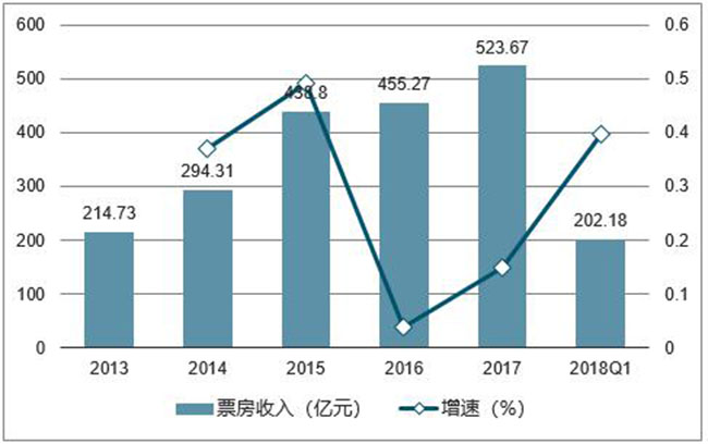 2013-2018Q1 全国票房收入及增速(数据来源:公开资料整理)