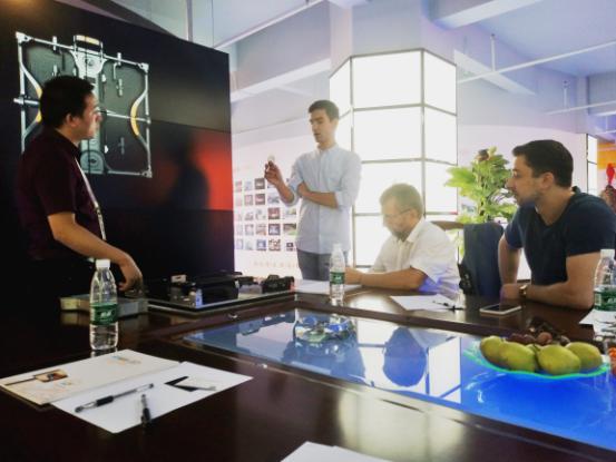 研发部负责人正在与RGGLED董事长一行讨论星空游戏自主创新的产品