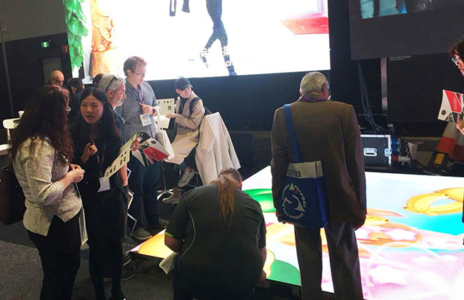 本次展出的P4.81 LED互动地砖屏,采用全新的纳米镀膜模式,在承重、防护性能、及散热性能等方面做过特殊设计,能适应高强度踩踏,长时间正常运行。其红外感应设计,可以跟踪人的运动轨迹,能够跟随人体的活动呈现即时的画面效果。
